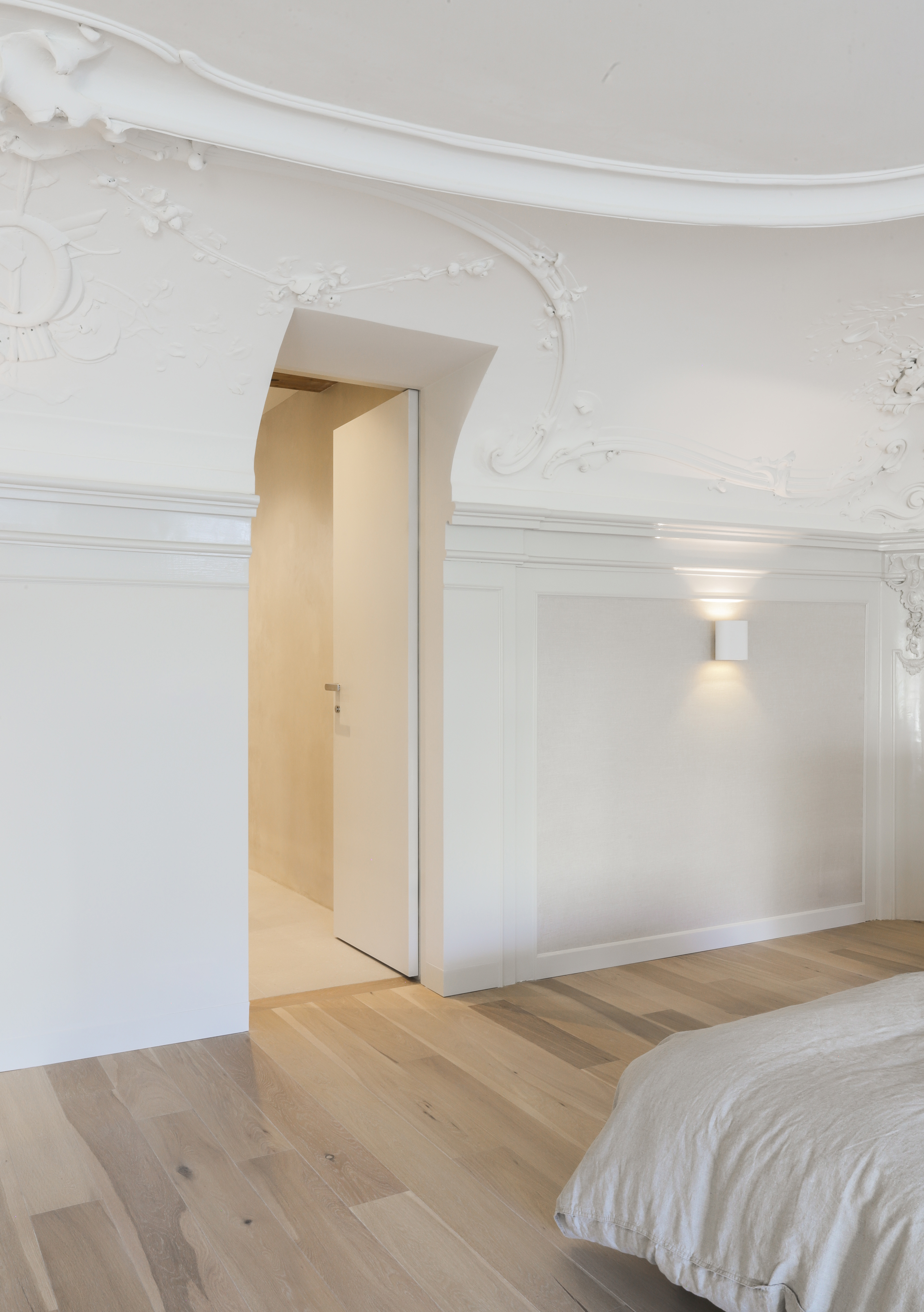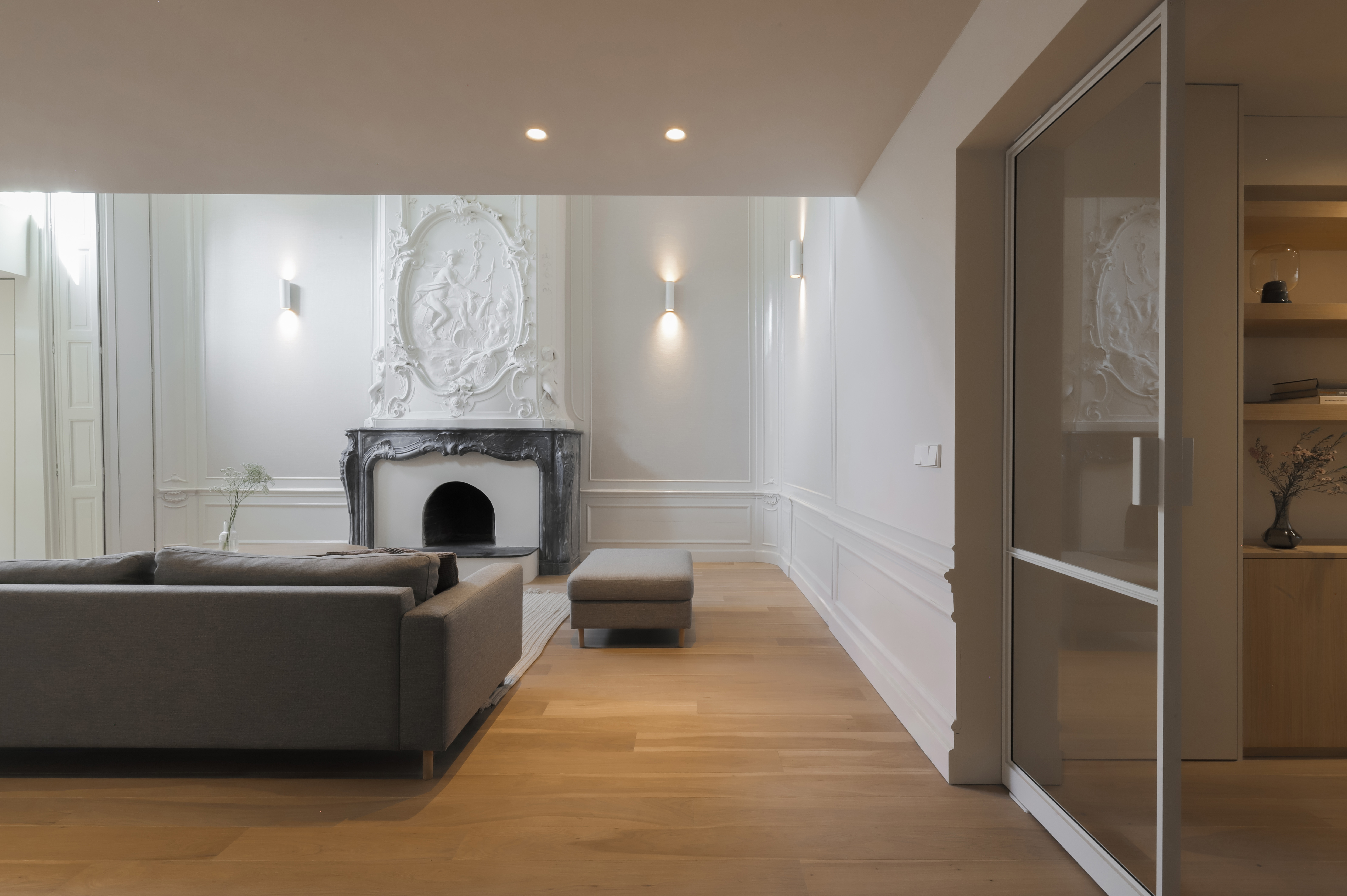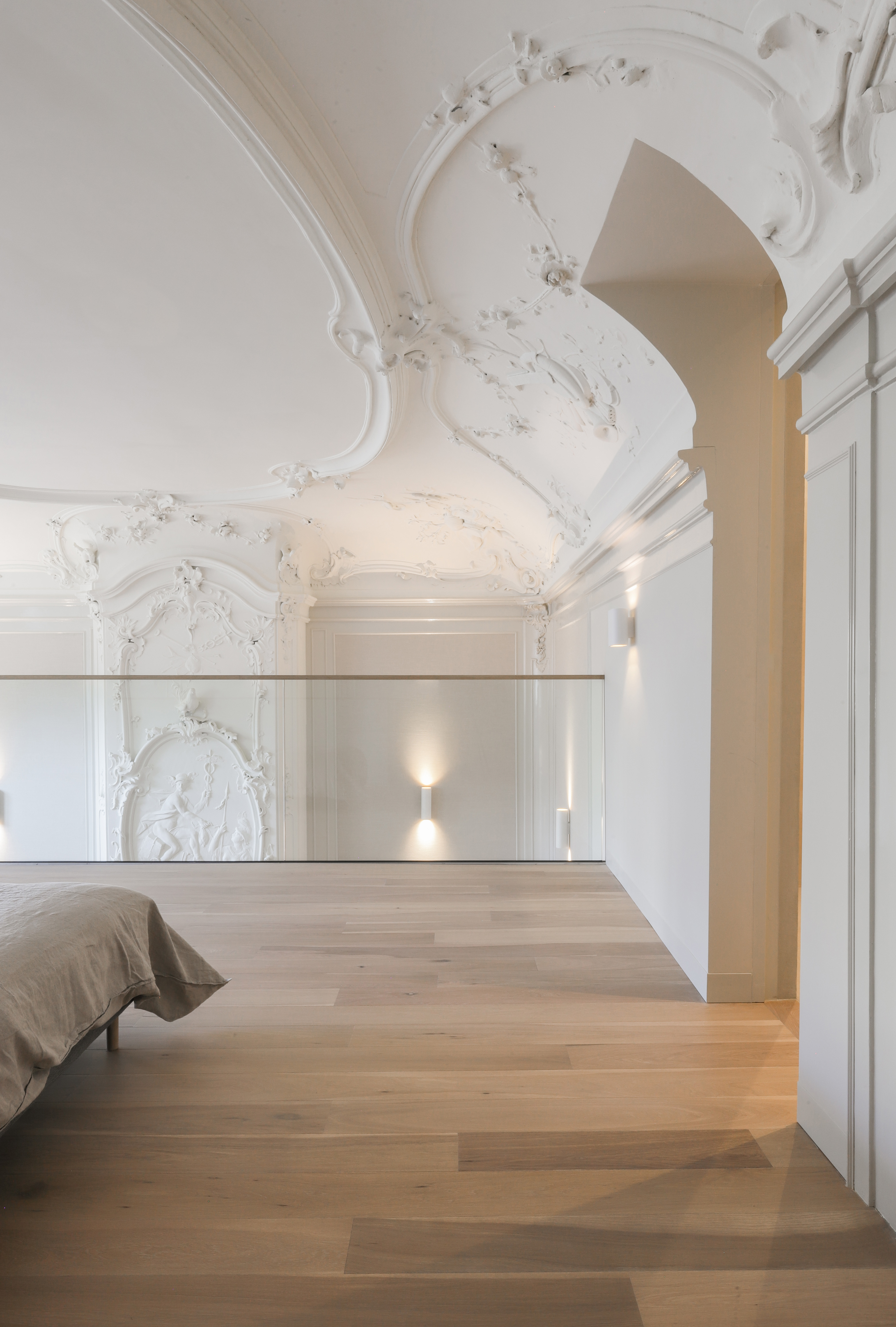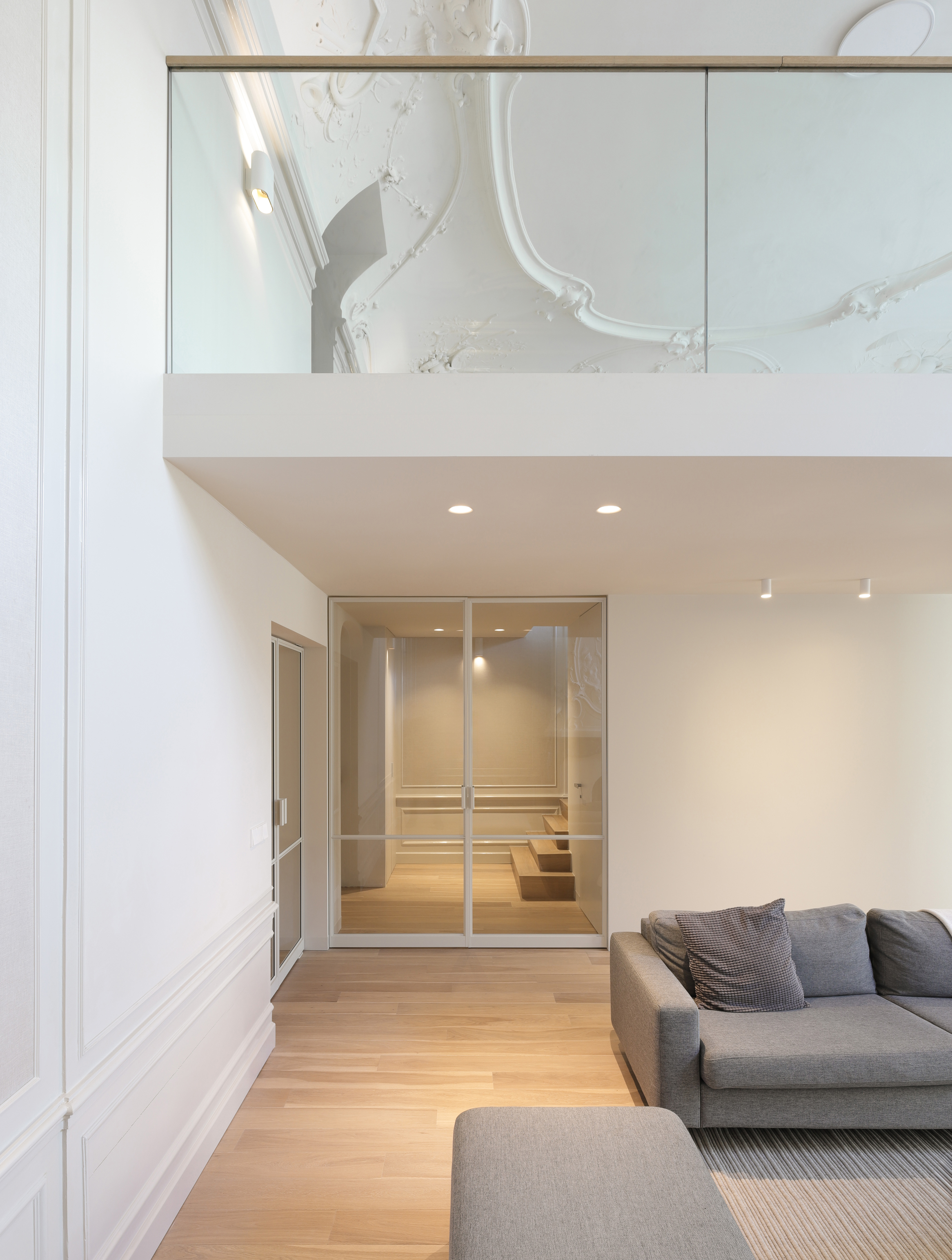On the mezzanine is a multifunctional space that can be used as both a bedroom and/or office. Here, you can fully appreciate the carefully restored, ornate stucco ceiling. A glass balustrade creates a beautiful connection with the fireplace.