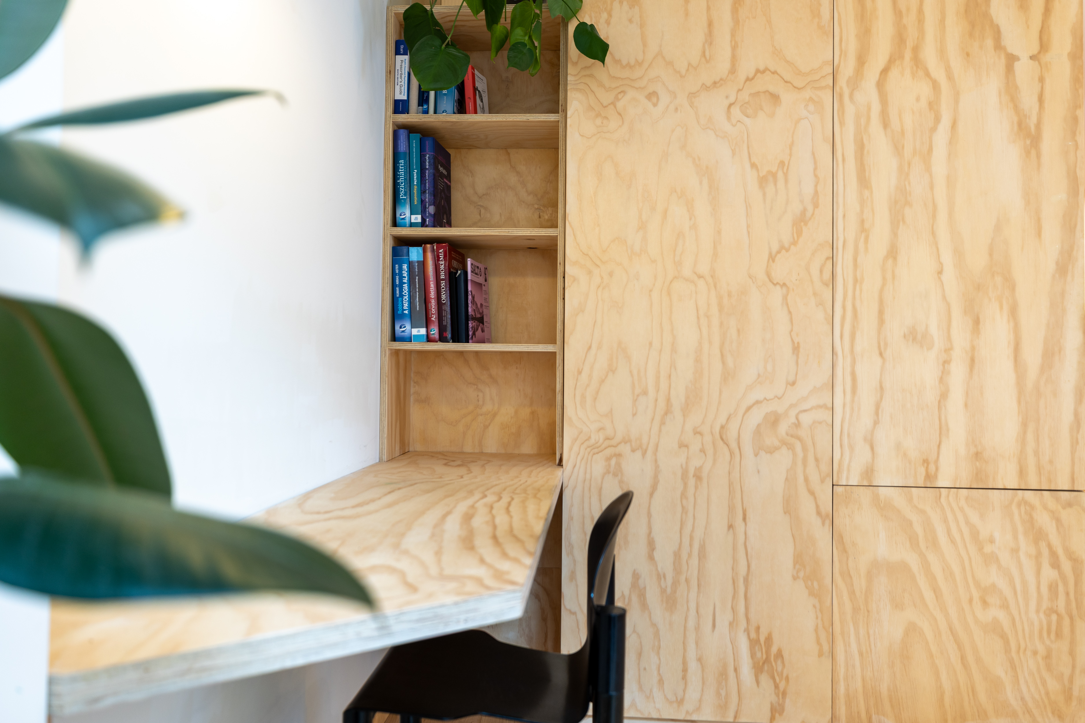 Since the large bedroom within the existing apartment had to be split up into two separate rooms, it enabled us to redesign the interior. We use the same diagonal gesture; connecting existing and new, creating one family. The diagonal organises the bedrooms, bathroom, and study into one half of the house, and the other half into the multifunctional corridor, the open kitchen and the living room.